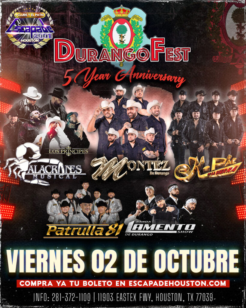 Este viernes 02 de octubre de 2026, Houston se enciende con la presentación exclusiva de Alacranes Musical, Montez de Durango, K-Paz de la sierra, Patrulla 81 y Banda Lamento en Escapade 2001, el nightclub latino más grande de la ciudad.