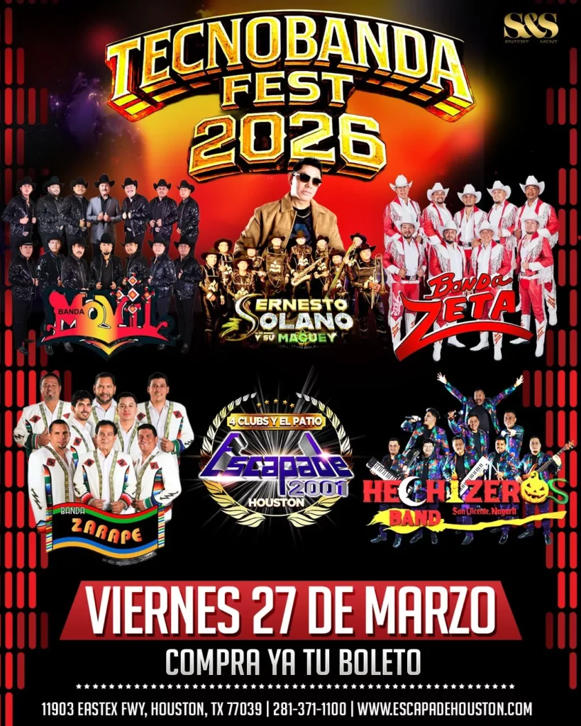 El viernes 27 de marzo de 2026, Houston recibe el TecnoBanda Fest 2026, un concierto de música banda en vivo que reúne en un solo escenario a Banda Móvil, Ernesto Solano (La Voz Original y Su Maguey), Banda Zeta, Banda Zarape y Hechizeros Band.