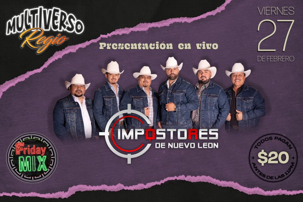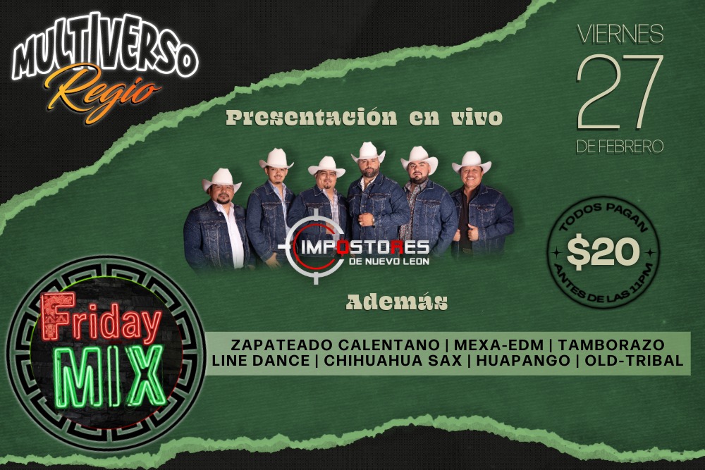 Vive un concierto de música norteña en Houston este viernes 27 de febrero con Impostores de Nuevo León y disfruta el Friday Mix con Zapateado Calentano, Mexa-EDM, Tamborazo, Huapango y más.